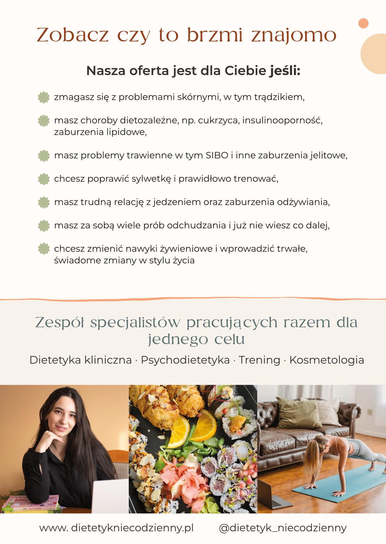 W jednym miejscu pracują specjaliści z dietetyki klinicznej, psychodietetyki, treningu i kosmetologii, co pozwala połączyć różne perspektywy bez sprzecznych zaleceń.